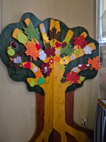 - Wir haben einen Gemeindebaum gebastelt, wo wir dem Gemeindeleben, Raum geben. Wir finden hier die Verstorbenen auf Herbstlaub. Wir finden die Konfirmanden, unsere frisch Vermählten, und unsere Gemeindebabys. Jeder Kirchenbesucher kann beim Betrachten des Gemeindebaums ein wenig Anteil am Gemeindeleben nehmen.