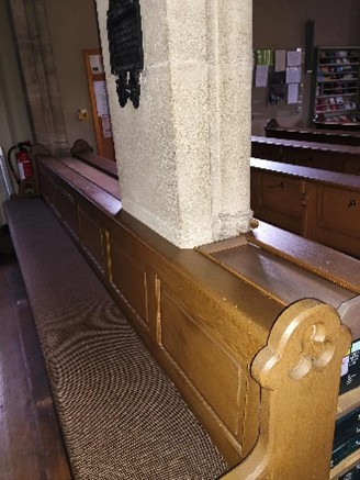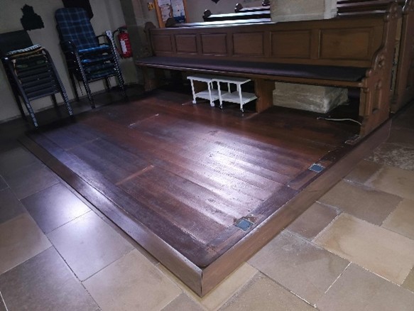 - Im hinteren Teil der Kirche wurden Bänke entfernt, um Platz für das Kirchenkaffee zu schaffen. Es ergab sich auf dem frei gewordenen Holzboden eine gemütliche, kleine Plauderecke mit Sitzgelegenheit, die aber immer noch recht beengt war. Außerdem stellte die Kante des Holzbodens eine Stolperstelle dar. So wurde die Schreinerei Sturm beauftragt, die Stolperstelle durch einen Keil zu entschärfen,die letzte Kirchenbank, zu versetzen und an die Säule anzupassen.