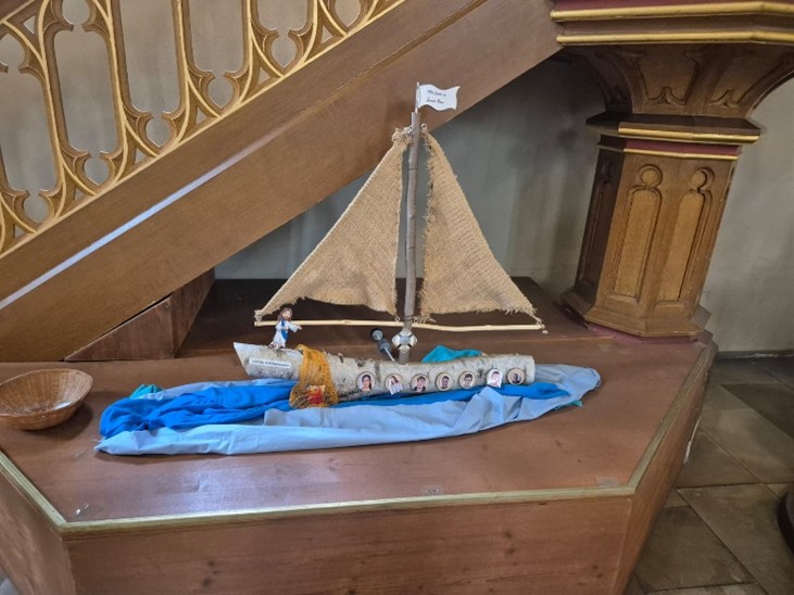 - Unsere Konfirmanden haben ein Konfirmandenschiff bekommen, das unter der Kanzel seinen Platz gefunden hat. Nach der Konfirmation finden die Konfirmandenbilder dann Platz am Gemeindebaum.