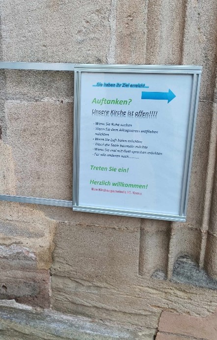 - An der Eingangstür lockt nun ein Willkommensschild und lädt zum Verweilen in unserer offenen Kirche ein.