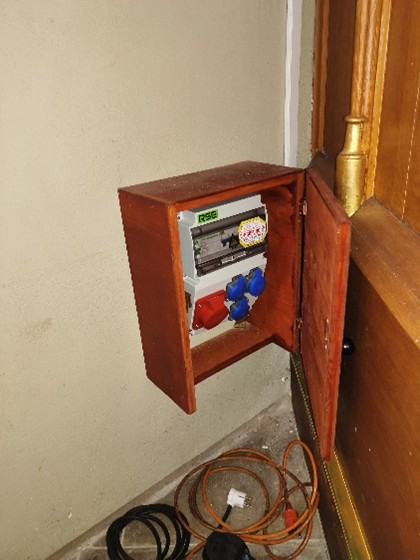 - Unsere Orgelempore wurde mit einer neuen Stromleitung versorgt. Die alte Leitung war an der Kapazitätsgrenze und musste erneuert werden. Dies geschah in Eigenleistung. Dabei wurde auch gleich ein Stromanschlusskasten neben der Sakristei installiert.